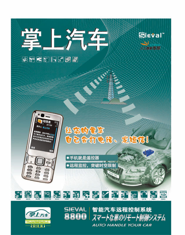 这一利基市场需求促使我公司开始利用现已在全球广泛部署使用的GSM蜂窝通讯网络技术来开发可进行大致定位的GSM汽车定位仪。公司最新开发出的GSM短信/呼叫汽车智能防盗报警终端SIEVAL-8800只需发一条短信就可以在几秒钟内收到汽车状态信息(如大致位置、车门开关和引擎开关)报告短信,它也可在汽车车门或引擎被非法打开时自动以短信方式向车主报警。本智能报警终端只需利用一个GSM基站就可以算出汽车的大概位置,即在某个基站方圆几百米之内,具体精度可以设置或调节。