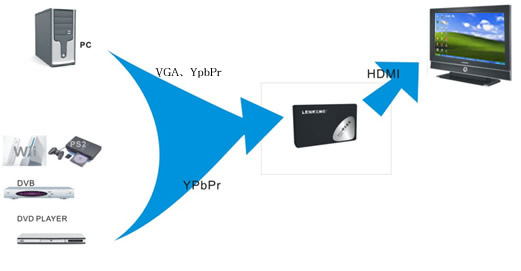 将PC的VGA信号和AUDIO信号转换成为高清格HDMI信号输出。将HD、YpbPr和左右声道信号转换成为高清格式HDMI信号输出。